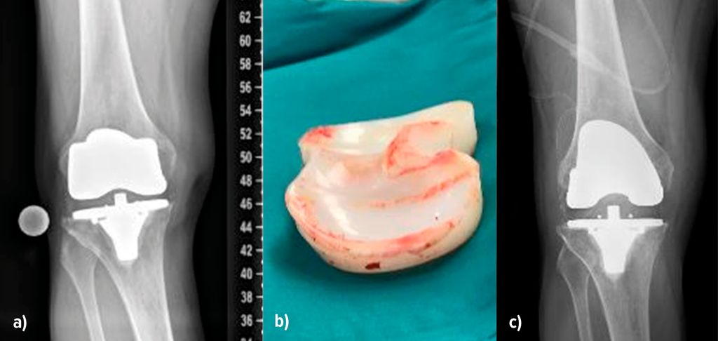 Abb. 1:Instabilität infolge eines Verschleisses. Im ap. Röntgenbild (a) sind die vermehrte laterale Aufklappbarkeit und die mediale Verschmälerung des Gelenkspaltes gut sichtbar. Das Inlay weist deutliche Verschleissspuren auf (b). Nach dem Wechsel auf ein neues Inlay in primärer Höhe ist im Röntgenbild der Gelenkspalt wieder gleichmässig dargestellt (c)