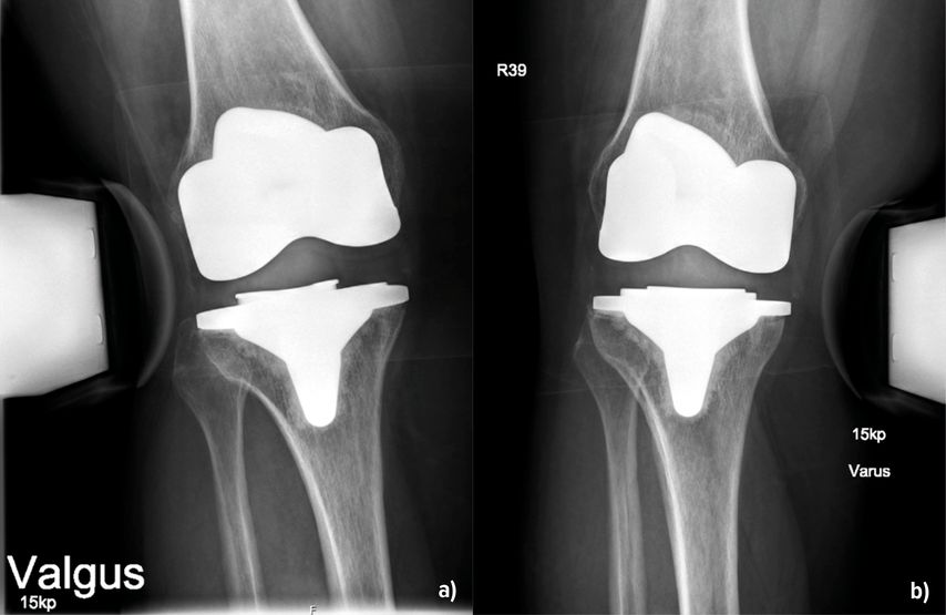 Abb. 2: 53-jährige Patientin 14 Monate nach KTEP-Implantation mit klinisch und radiologisch (a und b) nachweisbarer Instabilität – medial stärker als lateral
