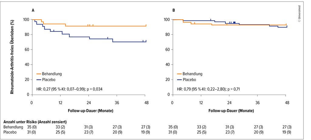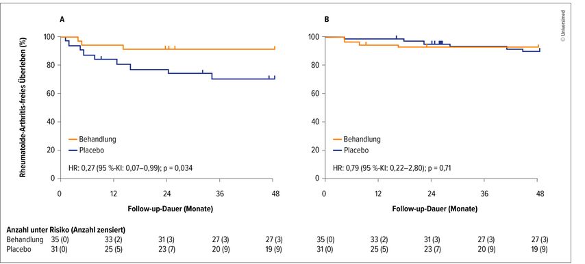 Abb. 1: 4-Jahres-Follow-up der TREAT-EARLIER-Studie (MTX) bei ACPA-negativen Patient:innen mit klinisch suspekter Arthralgie. Arthritisfreies Überleben unter MTX vs. Placebo; A: erhöhtes Risiko, B: niedriges Risiko für persistierende inflammatorische Arthritis