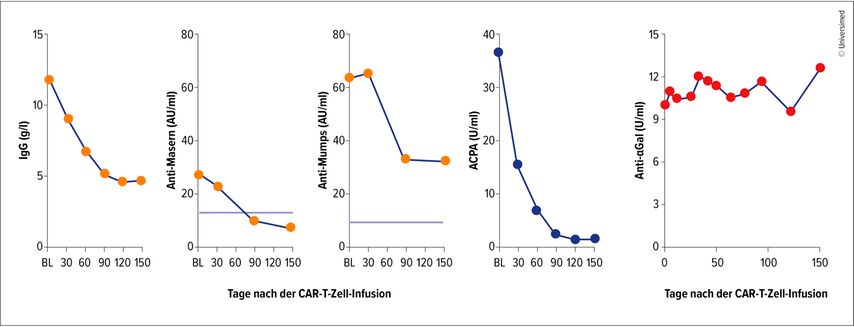 Abb. 2: Antikörperprofile (IgG, Anti-Masern, Anti-Mumps, ACPA, Anti-Alpha-Gal) nach CART-T-Zell-Infusion