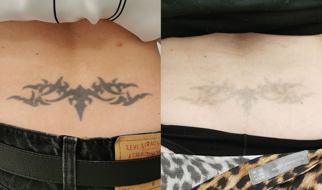 Abb.4: Tattoo am Steißbein vorher (links) sowie nach 6 Behandlungen mit dem Laser (rechts)