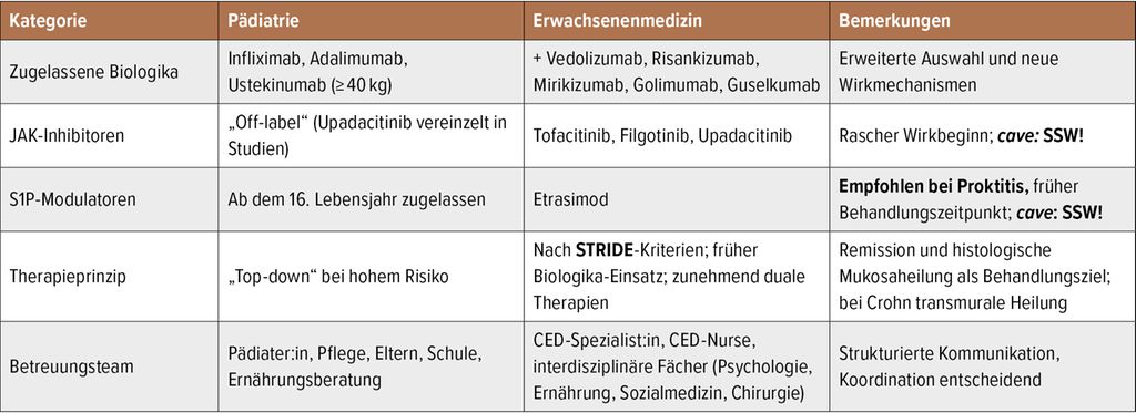 Die Therapielandschaft der CED hat sich in den letzten Jahren stark erweitert (Tab.1). Für Kinder und Jugendliche sind Infliximab, Adalimumab und seit 2025 auch Ustekinumab (ab 40kg) zugelassen. Viele neuere Substanzen – etwa Integrin-Antagonisten, JAK-Inhibitoren oder S1P-Modulatoren – stehen nur Erwachsenen zur Verfügung. Parallel spielen Ernährung, Impfstatus, Vitamin-D-Status und Knochengesundheit eine wichtige Rolle, ebenso einfache Regime zur Sicherung der Adhärenz. Auch die Erwachsenenmedizin steht vor besonderen Herausforderungen: Die Ausreifung des präfrontalen Cortex – zuständig für Organisation, Impulskontrolle und Aufmerksamkeit – ist erst mit etwa 25 Jahren abgeschlossen. Junge Erwachsene benötigen weiterhin Unterstützung bei organisatorischen Aufgaben, Entscheidungsprozessen und beim Aufbau von Selbstkompetenz. Ebenso entscheidend ist die Anpassung der Kommunikation an die Generation Z – kurze, klare Informationen und Offenheit für digitale Medien fördern Akzeptanz und Adhärenz.