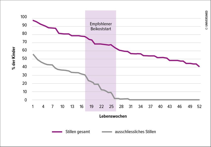 Die WHO empfiehlt, in den ersten sechs Lebensmonaten ausschliesslich zu stillen. Anschliessend soll das Stillen zusätzlich zur Einführung von fester Nahrung bis zu einem Alter von zwei Jahren und darüber hinaus fortgesetzt werden.3 Die zahlreichen Vorteile des Stillens für die Gesundheit von Mutter und Kind sind weitreichend bekannt und gelten für einkommensstarke wie -schwache Länder.4 National empfiehlt die Schweizerische Gesellschaft für Pädiatrie (SGP) ebenfalls ein ausschliessliches Stillen bis zum sechsten Lebensmonat. Die individuell angepasste Beikosteinführung soll frühestens ab dem vollendeten vierten Lebensmonat und spätestens mit Beginn des siebten Lebensmonats erfolgen.5