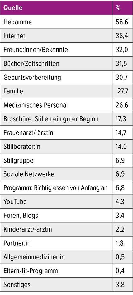 Die Hälfte aller Frauen informiert sich während der Schwangerschaft über das Stillen. Als Hauptinformationsquelle wird an erster Stelle der Kontakt zur Hebamme genannt (58,6%), an zweiter Stelle folgt das Internet (36,4%), gefolgt von Freund:innen bzw. Bekannten der Frau (32,0%). Die Frauenärztin bzw. der Frauenarzt wird erst an neunter Stelle angeführt (Tab. 1).9 Die Inanspruchnahme einer Stillberatung hängt u.a. mit dem Grad der Bildung bzw. der Eigeninitiative der Eltern zusammen. Frauen mit niedrigem sozioökonomischem Status werden seltener vor Geburt informiert, besuchen weniger häufig einen Geburtsvorbereitungskurs und werden seltener nach der Geburt zu Hause von einer Hebamme betreut.10 Folglich weisen Frauen in belasteten Lebenslagen (dazu gehören ein niedriges formales Bildungsniveau sowie eine Zuordnung als einkommensarm oder einkommensschwach und eines der folgenden Kriterien: junge Mutterschaft vor dem 22. Lebensjahr, Adipositas mit BMI ab 30kg/m2, Raucherin) tendenziell negativ geprägte Stillerfahrungen auf.11