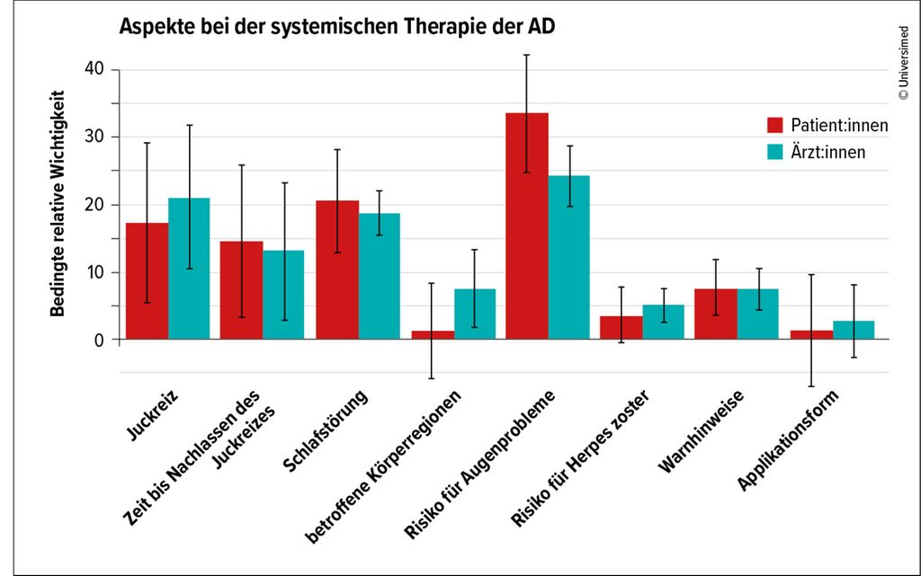 Abb. 1: Die Prioritäten der Patienten bei der systemischen Therapie der AD unterscheiden sich zum Teil von den Prioritäten der Behandler (modifiziert nach Durno N et al.)1