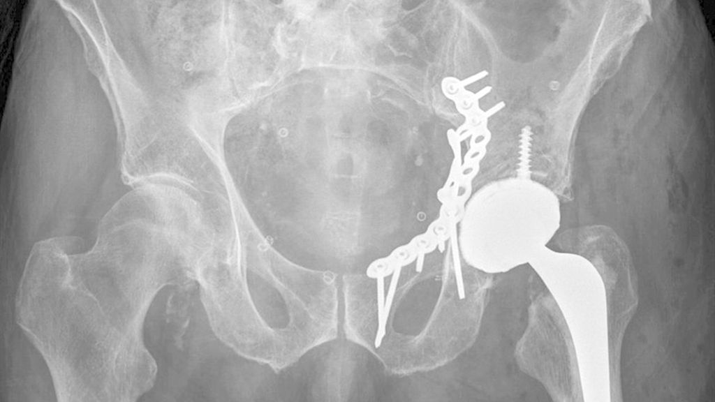 Abb. 2: „Fix and replace“ mit Osteosynthese und Hüfttotalendoprothese in der selben Operation bei geriatrischer Acetabulumfraktur mit Impressionsfraktur des Doms