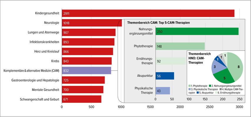 Der höchste Grad der Evidenz zeigt sich bei Metaanalysen und systematischen Reviews (MASR) von randomisiert kontrollierten Studien („randomized controlled studies“; RCT). International gilt die unabhängig agierende Cochrane Collaboration als Goldstandard für Metaanalysen. Mit Stand 31.12.2025 gab es 9531 publizierte MASR, wobei der Themenbereich „complementary & alternative medicine“ (CAM; Komplementär- und Alternativmedizin) auf Platz 7 von 37 Themenbereichen liegt (Abb. 1). Zu den Top-5-CAM-Therapien zählen „Supplemente“, „Phytotherapie“, „Ernährungsmedizin“, „Akupunktur“ und „physikalisch basierte Therapien“ (Abb.1). Im CAM-Segment wurden 41 MASR zum Themenbereich „Lunge & Atemwege“ und 19 MASR zum Themenbereich „Hals, Nasen & Ohren“ durchgeführt.