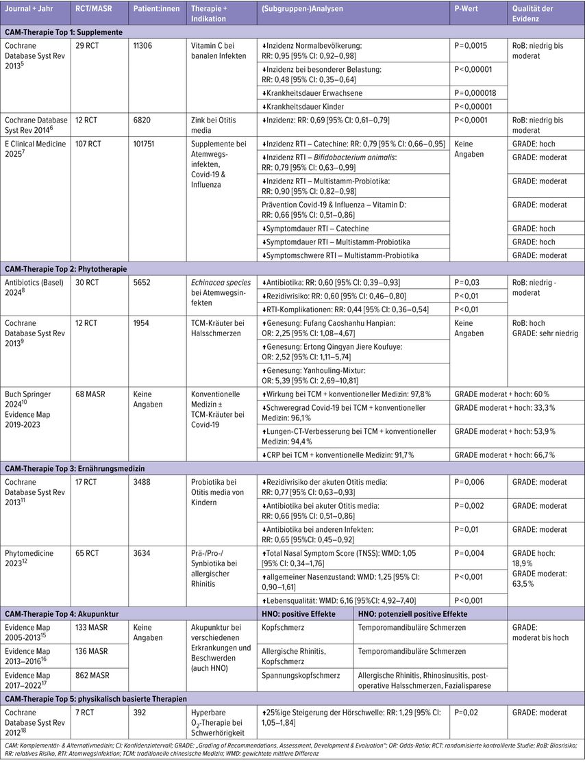 Tab. 1: Metaanalysen und systematische Reviews (MASR) zu Therapien der komplementären Medizin bei HNO-Indikationen (modifiziert nach Panhofer P 2026)