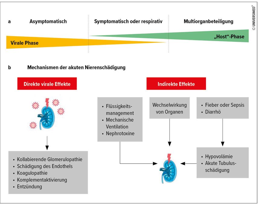 Die Covid-19-assoziierte Nierenschädigung ist häufig. Es hat sich gezeigt, dass verschiedene Mechanismen für das Auftreten einer akuten Nierenschädigung unter Covid-19 verantwortlich sind. Neben einem potenziellen renalen Tropismus von SARS-CoV-2 spielen vor allem systemische Auswirkungen der Viruserkrankung und bei kritisch erkrankten Patienten intensivmedizinische Interventionen, bakterielle Superinfektionen, Volumentherapie und Nephrotoxine eine entscheidende Rolle bei der Entstehung der AKI. 1617