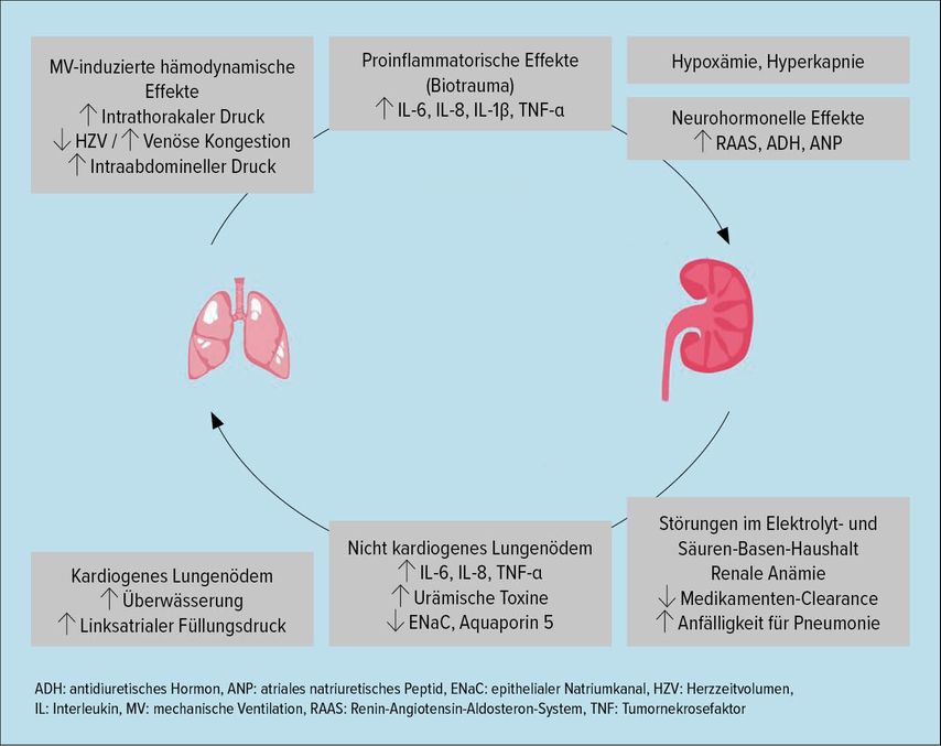 Abb. 2: Mechanismen, die zu einer gegenseitigen Verschlechterung der Organfunktion von Lunge und Niere führen können (modifiziert nach Klein SJ et al. 2018)24