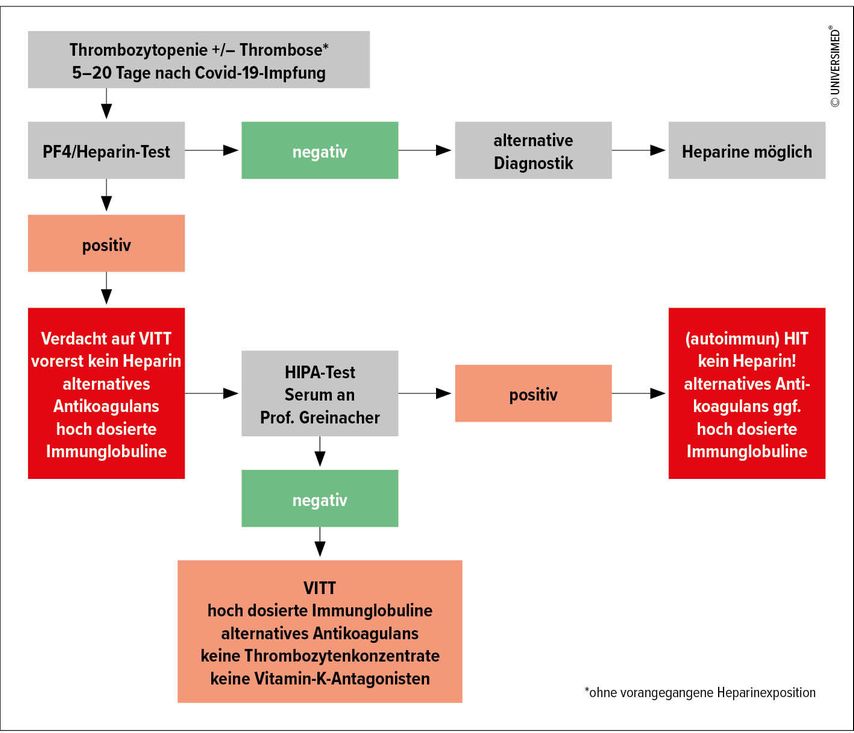 1 Eichinger S et al.: Thrombocytopenia associated with low-molecular-weight heparin. Lancet 1991; 337(8754): 1425-6 2 Greinacher A et al.: Autoimmune heparin-induced thrombocytopenia. J Thromb Haemost 2017; 15(11): 2099-114 3 Greinacher A et al.: Thrombotic thrombocytopenia after ChAdOx1 nCov-19 vaccination. N Engl J Med 2021; doi: 10.1056/NEJMoa2104840 4 Eichinger-Hasenauer S et al.: Auftreten von Thrombosen im Zusammenhang mit einer Covid-19-Impfung – vaccine-induced immune thrombotic thrombocytopenia (VITT) – Empfehlungen zur Diagnostik und Therapie (Stand: 12.4.2021), auf Anregung des österreichischen nationalen Impfgremiums. https://www.oegho.at/fileadmin/Benutzer/GTH_Stellungnahme_AstraZeneca_engl._3_29_2021.pdf ; zuletzt aufgerufen am 17.5.2021