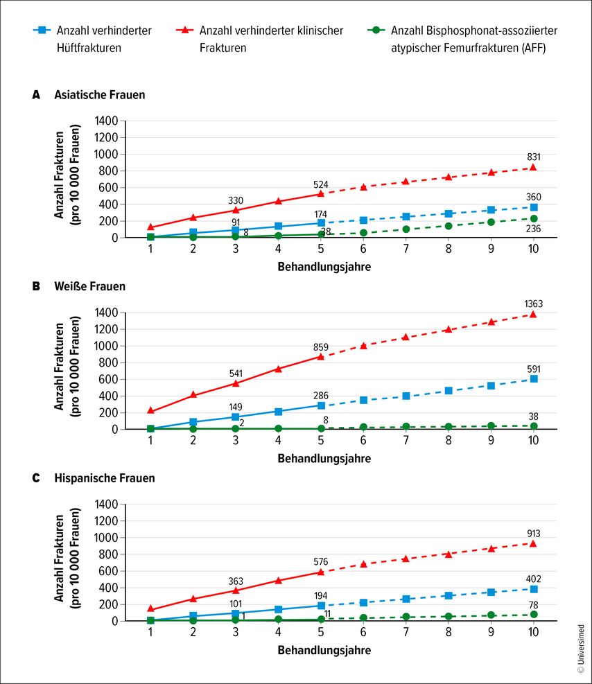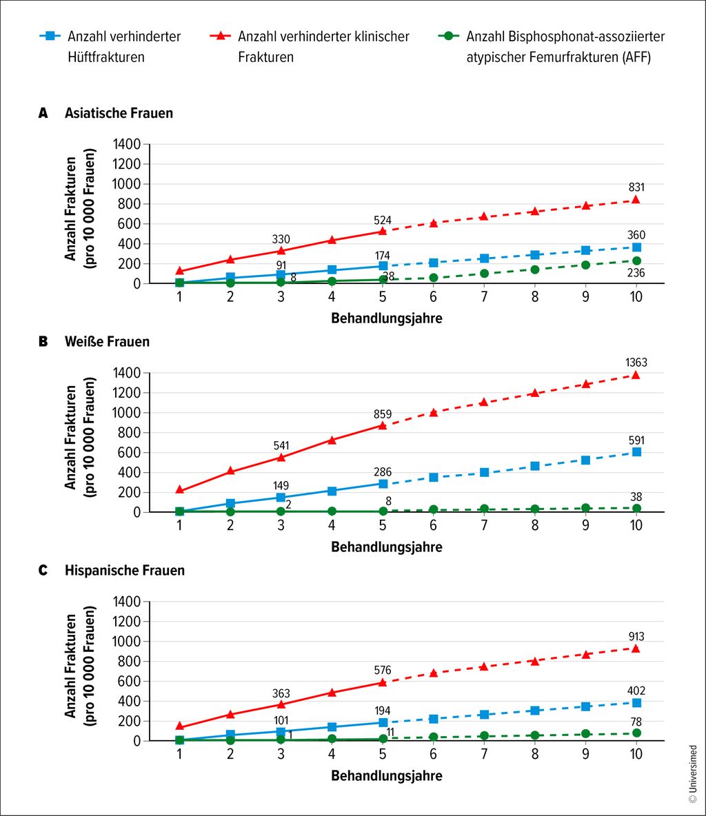 Bisphosphonate sind Standard in der Osteoporosetherapie und wirksam in der Prävention osteoporotischer Frakturen. Allerdings sind sie in seltenen Fällen mit atypischen Frakturen, vor allem jenen des Femurs (AFF), assoziiert. In der Praxis kann das zu einem schwierigen Dilemma führen, für dessen Auflösung wenig Evidenz verfügbar ist.