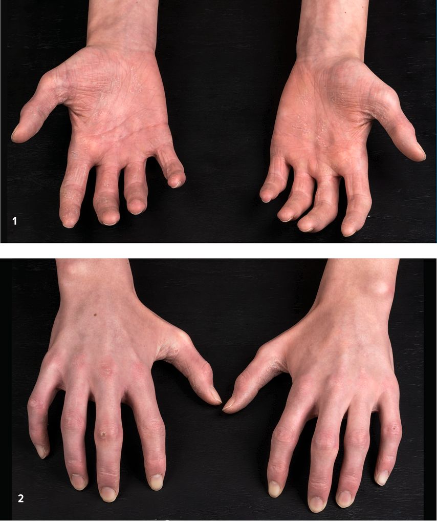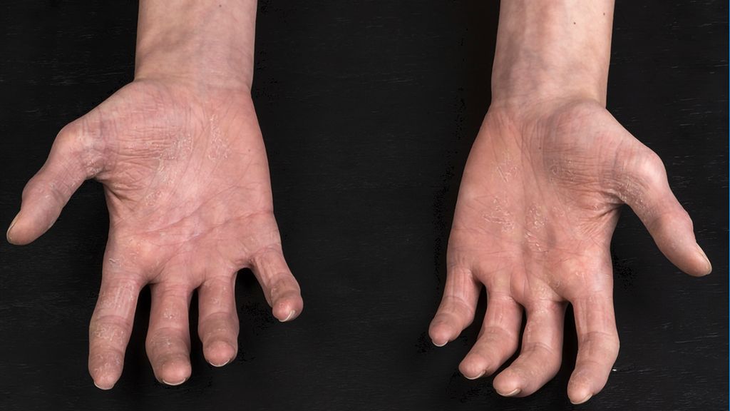 Ein 15-jähriger Patient wurde aufgrund von schmerzhaften Fingergelenken mit Morgensteifigkeit, schuppenden Hautveränderungen an den Hand- und Fußsohlen sowie Rötungen im Gesichtsbereich in unserer pädiatrisch-dermatologischen Ambulanz vorgestellt. Die Symptomatik bestand bereits seit einem Jahr. Zudem waren ein Gewichtsverlust von circa 22kg in den letzten zwei Jahren, eine wiederkehrende Dyspnoe im Liegen und eine Dysphagie zu erheben.