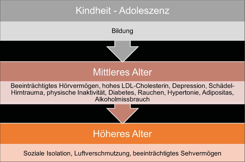 Abb. 1: Risikofaktoren für kognitiven Abbau über die Lebensphasen (nach Livingston G et al.: Dementia prevention, intervention, and care: 2024 report of the Lancet standing Commission. Lancet 2024; 404[10452]: 572-628)