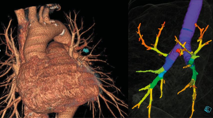Beginnend mit der Bildgebung sollte zum initialen Staging eine Körperstamm-Computertomografie (CT) in Verbindung mit einer FGD-Positronenemissionstomografie (FGD-PET) durchgeführt werden (LoE I, A; European Society for Medical Oncology/ESMO).1 Dies ermöglicht ein entsprechendes Staging zur Planung weiterer Modalitäten. Die CT sollte, wenn möglich, nicht älter als vier Wochen sein (LoE III, B; ESMO)1, um etwaige intraoperative „Überraschungen“ zu vermeiden. Hierbei sollte auch immer an die Möglichkeit einer Segmentektomie und die damit verbundene OP-Planung gedacht werden. Da von chirurgischer Seite präoperativ die Gefäßanatomie und der Resektionsabstand eingeschätzt werden müssen, erleichtert eine Dünnschicht- bzw. High-Resolution-CT die Planung signifikant. Dies ermöglicht ebenso eine 3D-Rekonstruktion der CT, um die Segmentarterien und -bronchien darzustellen (Abb. 1).2,3
