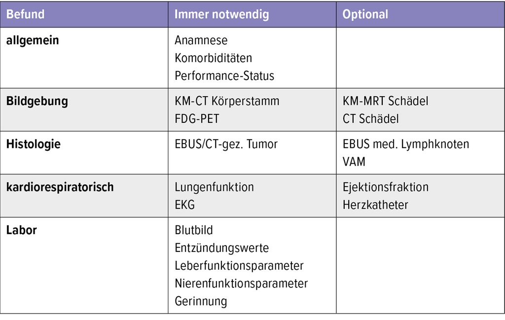 Zur kompletten Abklärung für die Tumorboard-Besprechung werden benötigt: KM-CT Körperstamm (eventuell mit Schädelbildgebung), Histologie (+/– gesicherte mediastinale Lymphknoten), Lungenfunktion, Allgemeinzustand, Anamnese, Labor.