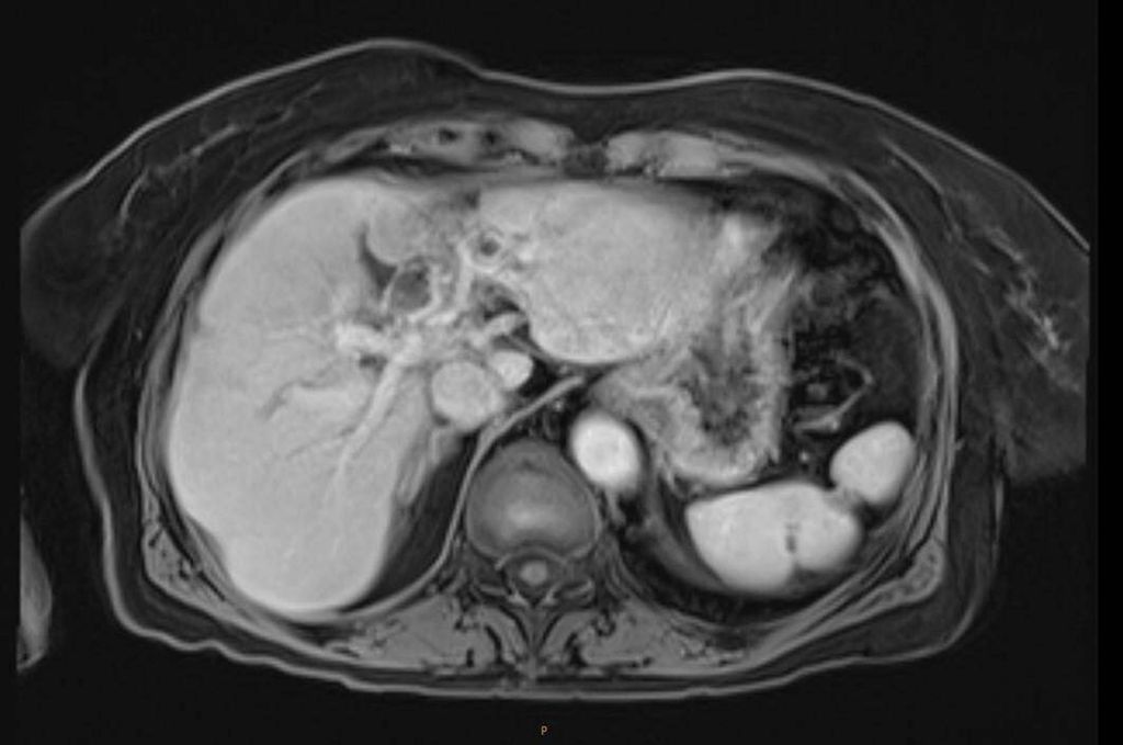 Im Oktober 2020 stellte sich eine 80-jährige Patientin erstmals in der GI-onkologischen Ambulanz Innsbruck vor. Sie berichtete über vor wenigen Wochen aufgetretene, von vermehrtem Aufstoßen begleitete, kolikartige Oberbauchschmerzen, die initial als Gastritis fehlgedeutet wurden. Seit einer Woche war sie zunehmend ikterisch. Bei der sonografischen Abklärung zeigte sich eine tumoröse Raumforderung der Leber.