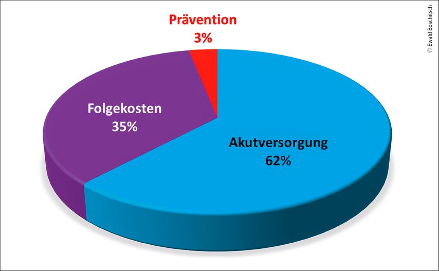 Die direkten Kosten der Osteoporose haben in Österreich im Jahr 2019 1,34 Milliarden Euro betragen (und werden derzeit auf etwa 1,5 Milliarden Euro geschätzt). Davon entfielen im ersten Jahr nach der Fraktur 833,5 Millionen Euro (62%) auf die medizinische Akutversorgung, hauptsächlich die stationäre Versorgung von Hüftfrakturen, und 468,1 Mio. Euro (35%) auf die Folgekosten durch Langzeitbehinderung, hauptsächlich die Betreuung in Pflegeheimen. Nur 41,7 Mio. Euro (3%) wurden für die Frakturprävention, hauptsächlich die pharmakologische Therapie, inklusive Therapiemonitoring, aufgewendet (Abb. 1).13