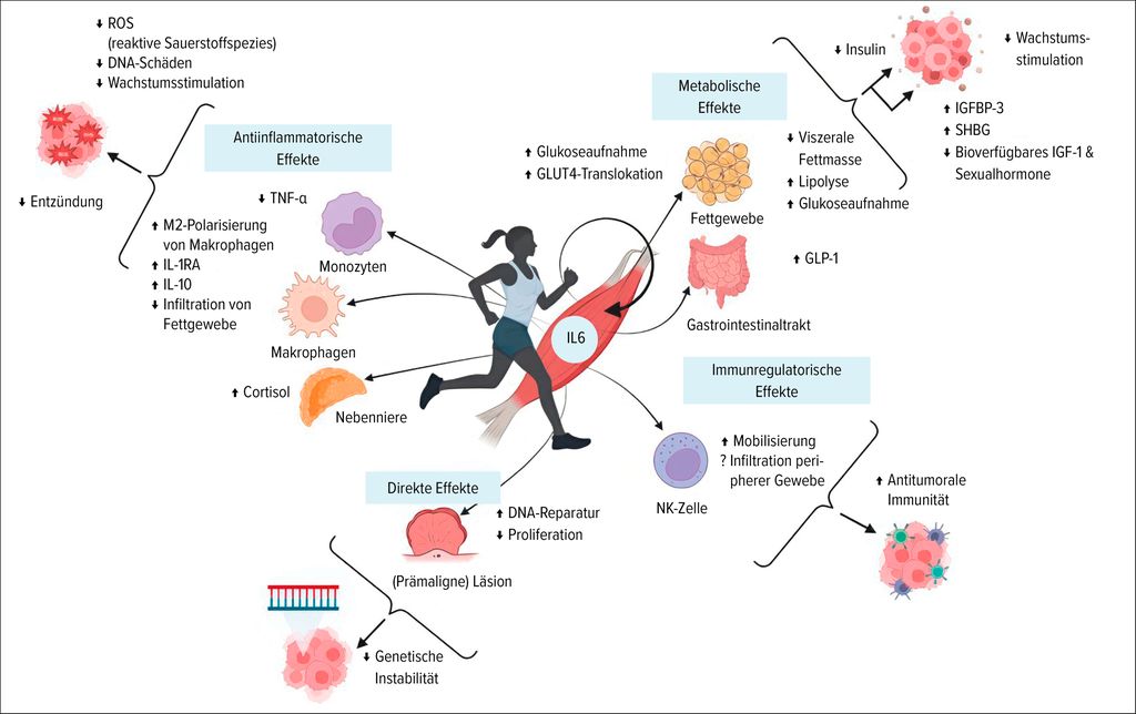 Ein ganz wesentlicher Punkt scheint ein entzündungshemmender Effekt zu sein. Bewegung durchbricht den Teufelskreis der chronischen Inflammation durch antiinflammatorische Zytokine, aber auch indirekt durch Reduktion des viszeralen Fetts sowie eine Reduktion von kardiovaskulären Risikofaktoren. Adipositas ist mit einer chronischen, niedriggradigen Entzündungsreaktion assoziiert, die sich nachteilig auf die Gesundheit auswirkt. Bei Bewegung kommt es durch Muskelkontraktion-induzierte Myokine (z.B. IL-6, IL-7, IL-15) zu einer Senkung chronischer Entzündungsparameter (CRP, Interleukine). IL-6 begünstigt die intratumorale Immunzellinfiltration.