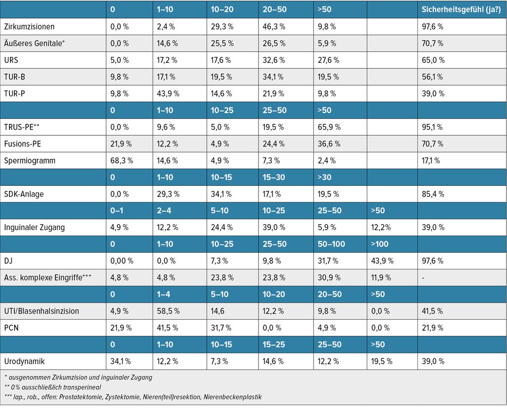 Nur 37% der Befragten gaben an, dass sie glauben, die benötigten Fallzahlen für das Rasterzeugnis/die Rasterzeugnisse zu erfüllen. Zwar zeigte sich ein deutliches Ungleichgewicht zulasten der ersten Ausbildungsjahre, allerdings blieben bei 58% der Letztjahresassistent:innen mit vollständigem Rasterzeugnis immer noch 42%, die die Zahlen nicht erfüllen können. Dies hängt sicher auch mit der Verteilung der Operationszahlen auf die Ausbildungsjahre zusammen. Naturgemäß zeigt sich hier eine starke Abhängigkeit vom Ausbildungsjahr, mit einer deutlichen Steigerung der OP-Anzahl bzw. auch der Komplexität der Eingriffe über die Ausbildungsdauer. Aus diesem Grund präsentieren wir die abgefragten Zahlen zu konkreten Eingriffen zur besseren Interpretationsmöglichkeit nur für Assistenzärzt:innen der letzten drei Ausbildungsjahre (n=46). Dies soll auch helfen, einen Ausblick auf das zu erwartende neue Rasterzeugnis der Sonderfach-grundausbildung (siehe oben unter Ausbildung) zu wagen. Kennzahlen für die wichtigsten Operationen betragen im entsprechenden Vorschlag: TUR-P (20), TUR-B (30), UTI (10), URS (20), DJ-Anlage (50), PCN (10), suprapubischer Katheter/CF (15), Prostatabiopsie (25), inguinaler Zugang (10), skrotaler Zugang (20), Zirkumzision (20), Assistenz bei komplexeren urologischen Eingriffen (50). Zusätzlich ist die Urodynamik (15) als invasive Diagnostik gelistet. Die Interpretation des Spermiogramms ist nicht mit eigener Fallzahl im neuen Rasterzeugnis vorgesehen. Zur Erinnerung: Diese Eingriffe müssen ab Gültigkeit des neuen Rasterzeugnisses in den ersten drei Jahren der Ausbildung (Sonderfachgrundausbildung) absolviert werden. Für das präsentierte Kollektiv ab dem 4. Ausbildungsjahr stellen sie sozusagen die Mindestanforderung dar. Abgefragt wurden jeweils die Anzahl der durchgeführten Eingriffe und das Sicherheitsgefühl, den Eingriff eigenständig durchzuführen (Tab. 1).
