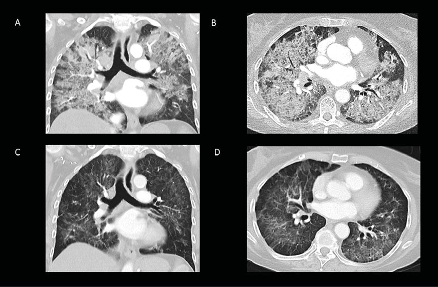 Abb. 1: A und B: CT-Thorax zum Zeitpunkt der Aufnahme mit disseminierter alveolärer Anschoppung in allen Lungenabschnitten. C und D: CT-Thorax zwei Wochen nach Therapie