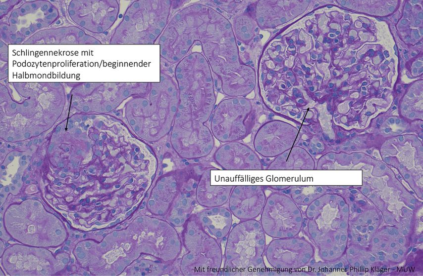 Abb. 2: Das linke Glomerulum zeigt eine fokale segmentale Schlingennekrose mit Fibrinextravasation und zellulärer Halbmondbildung. Als Gegenüberstellung ist rechts ein unauffälliges Glomerulum ohne morphologische Veränderungen dargestellt.