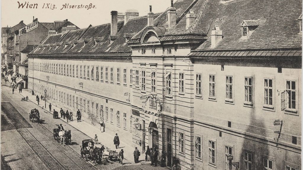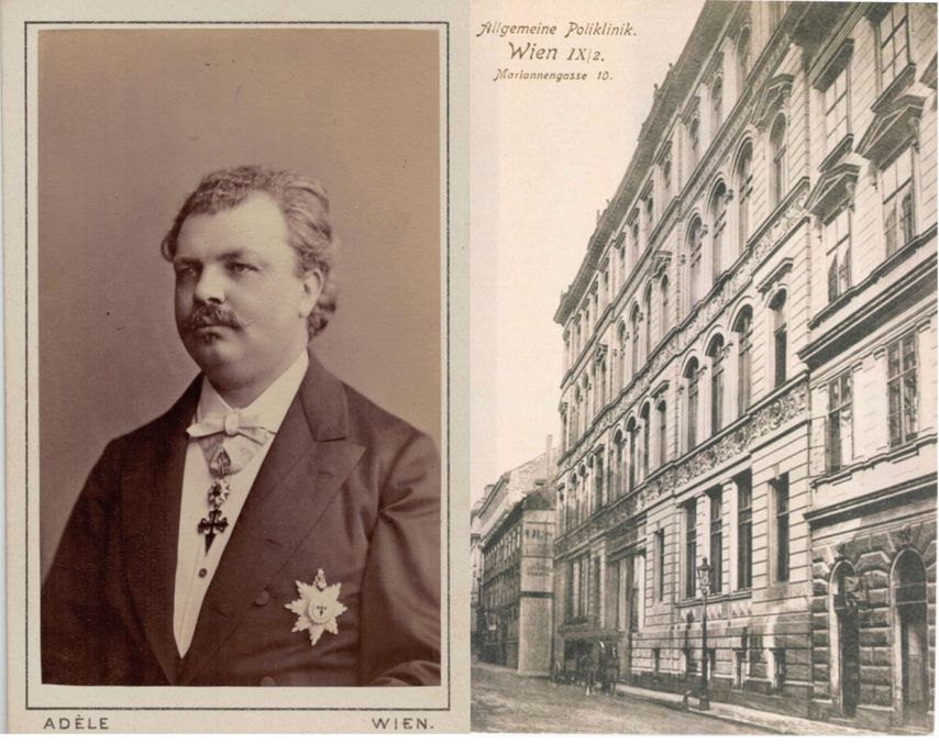 Abb. 7: A: Richard Übelhör. B: Altes Allgemeines Krankenhaus, Alser Straße 4, 9. Bezirk, Ansichtskarte koloriert: Am Ort des Allgemeinen Krankenhauses sollte sich die Geschichte der stationären Behandlung der urologischen Patienten schließen – vom Zimmer „getrennt nach Männern und Weibern“ hin zur ersten urologischen Universitätsklinik.
