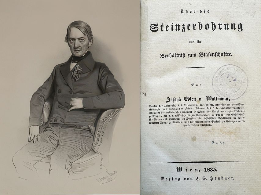 Abb. 2: A: Joseph Freiherr Wattmann von Maëlcamp-Beaulieu (1789–1866) , Stich von Joseph Kriehuber (1800–1876), 1844; B: Wattmanns Buchpublikation „Über die Steinzerbohrung und ihr Verhältnis zum Blasenschnitte“, Wien: Heubner 1835, trug im deutschsprachigen Raum zur Popularisierung der „blinden Blasensteinlithotripsie“ und zur guten therapeutischen Einordnung unter ausgewogener Berücksichtigung auch der technisch bedingten Probleme bei