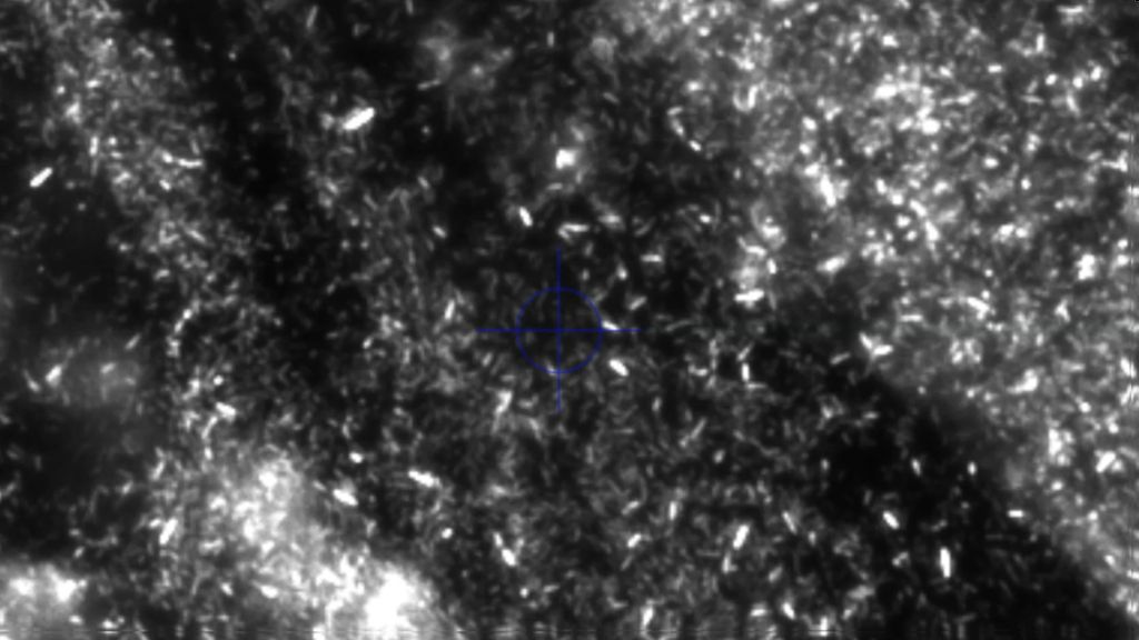 Abb. 2: Mikroskopische Darstellung von Fluoreszenz-markiertem Proteus mirabilis in und um den Struvitkristall nach Anzüchtung in artifiziellem Urin. Quelle: eigene Forschungsarbeit