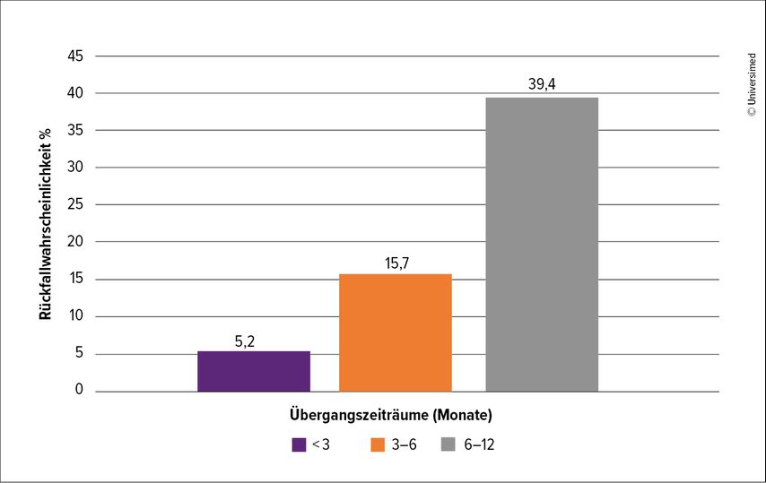 Während der Transition wurden ebenso signifikante Unterschiede festgestellt: 14 (5,2%) Patient:innen in der Gruppe <3 Monaten erfuhren einen Schub, 14 (15,7%) in der 3–6-Monate-Kohorte und 13 (39,4%) in der 6–12-Monate-Gruppe (p<0,001) (Abb. 1). Die Dauer der Switch-Periode hatte keinen signifikanten Einfluss auf ARR, EDSS-Progression und -Regression nach erfolgter Deeskalation.