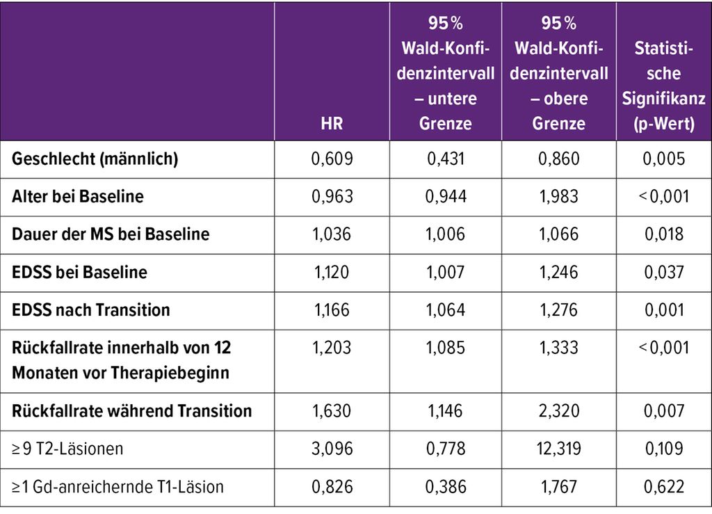 Folgende Prädiktoren zeigten ein herabgesetztes Risiko für Schübe nach der Deeskalation an: männliches Geschlecht, reduzierte ARR zur Baseline und während der Transition, höheres Alter und kürzere Krankheitsdauer zur Baseline und niedriger EDSS-Wert zur Baseline und nach der Transition (Tab. 1). Folgende Risikofaktoren wiesen hingegen auf ein erhöhtes Risiko für EDSS-Behinderung nach der Deeskalation hin: höheres Alter zur Baseline und höherer EDSS-Wert nach der Transition.
