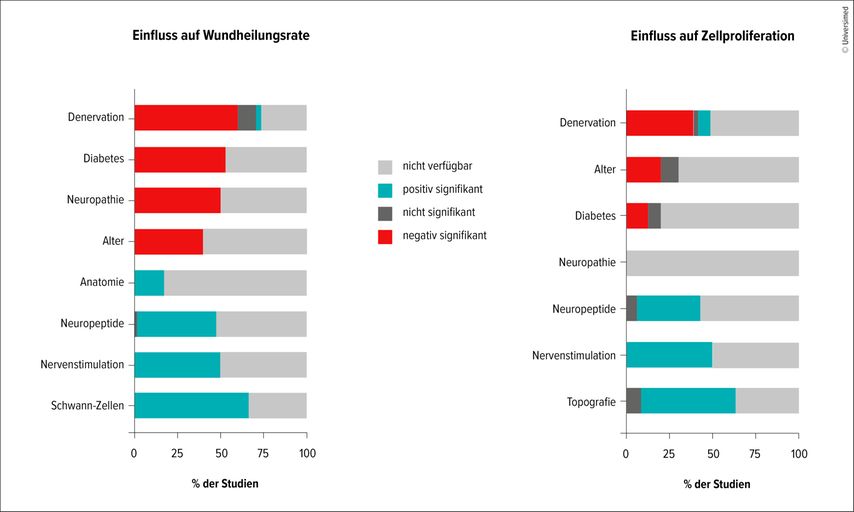 Die Faktoren mechanische und chemische Denervation, Diabetes mellitus, Neuropathie und Alter wirkten sich signifikant negativ auf die Wundheilungsrate aus. Ein signifikant negativer Einfluss auf die Zellproliferation konnte hingegen nur für Denervation und in rund einem Viertel der Studiendesigns für Alter und Diabetes mellitus identifiziert werden. Ein signifikanter Einfluss von Neuropathie auf die Zellproliferation konnte nicht festgestellt werden (Abb.2). In mechanischen und chemischen Denervationsstudien wurde spezifisch ein Verlust der sensorischen und autonomen Hautnerven beobachtet, was zu einer verzögerten Granulation und Reepithelisierung führte. Diabetes mellitus führte hingegen zu einer Verringerung der Innervation, einer Verzögerung der Wundheilung, einer Beeeinträchtigung der Fibroblastenproliferation und einer Verlangsamung der Reepithelisierung.