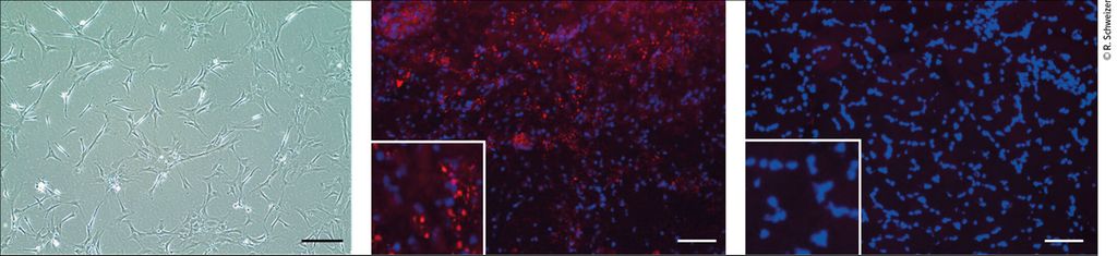 Abb. 5: Kultivierte mesenchymale Stammzellen aus dem Fett (ASC) von Spenderratten (links), PKH-26-markierte ASC (rot) in Transplantatbiopsien der mit ASC behandelten Ratten (Mitte) und Kontrollen ohne Behandlung (rechts) (nach Schweizer R et al. 2025)12