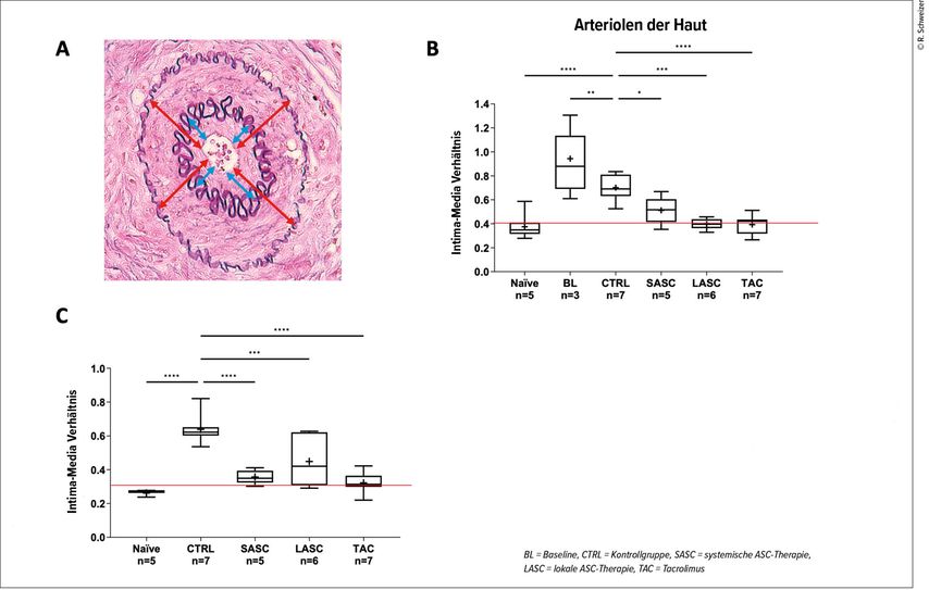 Abb. 4: Die Gefässwanddicke wurde in den verschiedenen Geweben des Transplantates gemessen und ein Intima-Media-Verhältnis als Indikator für die intimale Proliferation errechnet (A). Sowohl in Arteriolen der Haut (B) als auch der Muskeln (C) konnte eine signifikant reduzierte intimale Proliferation in den ASC-Gruppen gezeigt werden (nach Schweizer R et al. 2025)12