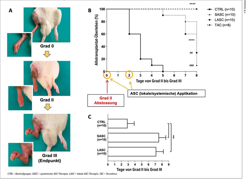 Abb. 3: Verschiedene Stadien der Abstossung: Grad 0 = normales postoperatives Ergebnis, Grad II = manifeste mässige Abstossung, Grad III = schwere Abstossung mit Epidermolyse und Nekrosen am Transplantat (Endpunkt) (A). Die Grafiken zeigen eine signifikante Verlangsamung der Abstossung unter ASC-Therapie (LASC/SASC) im Vergleich zu den Kontrollen ohne Therapie (CTRL), jedoch keine Remission (wie hingegen in der medikamentösen Gruppe TAC) (B–C) (nach Schweizer R et al. 2025)12