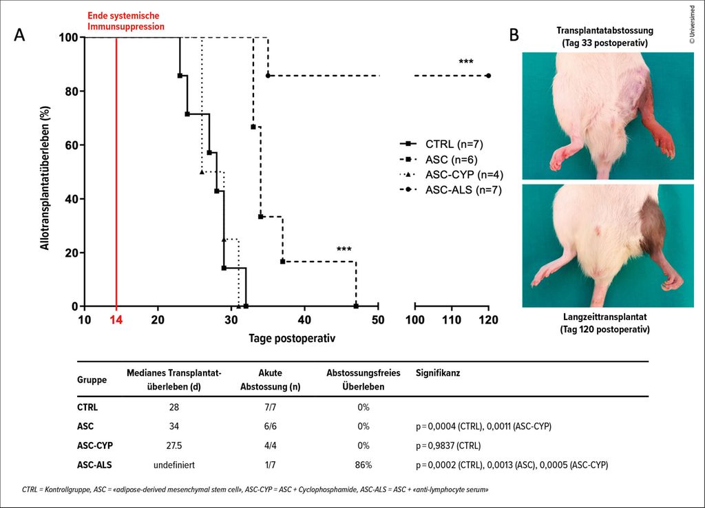 Während diese Zellen aus Fett oder Knochenmark von unserer und weiteren Gruppen bereits zur Prävention der Abstossung bei VCA und Toleranzentwicklung erfolgreich im Tiermodell getestet wurden (Abb.2),7–11 ging es in der aktuellen Studie um eine andere Frage: Können diese Stammzellen eine Abstossung behandeln, wenn sie bereits begonnen hat?