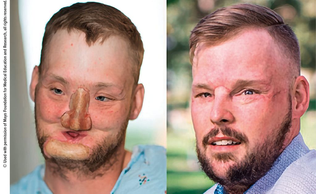 Abb. 1: Eindrucksvolles ästhetisches und funktionelles Beispiel eines Gesicht-transplantierten Patienten nach einer komplexen traumatischen Verletzung in suizidaler Absicht (Patient Andy Sandess, operiert durch Dr. med. Samir Mardini und Team an der Mayo Clinic)