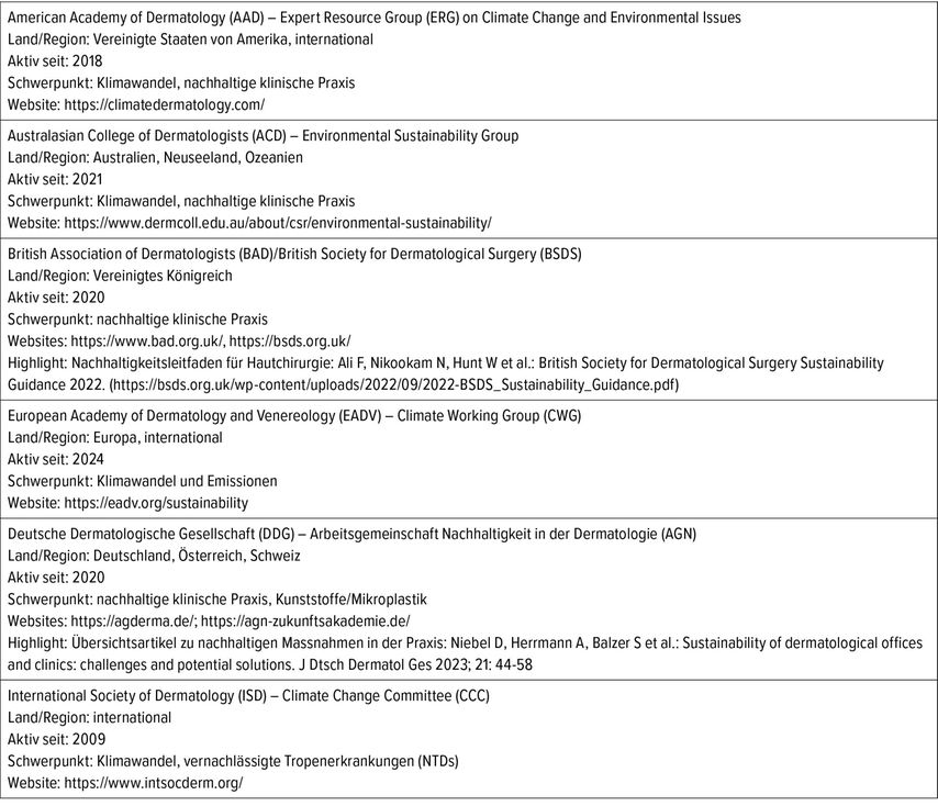 In den letzten Jahren haben sich Initiativen für ressourceneffiziente Dermatologie innerhalb nationaler und internationaler Fachgesellschaften aufgestellt; diese arbeiten aktiv an Klimaschutz- und Anpassungsstrategien.