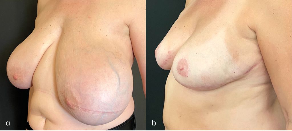 Fig. 1: Avant et après une skin-reducing mastectomy bilatérale et reconstruction immédiate par prothèses avec projection modérée et greffes libres de PAM.