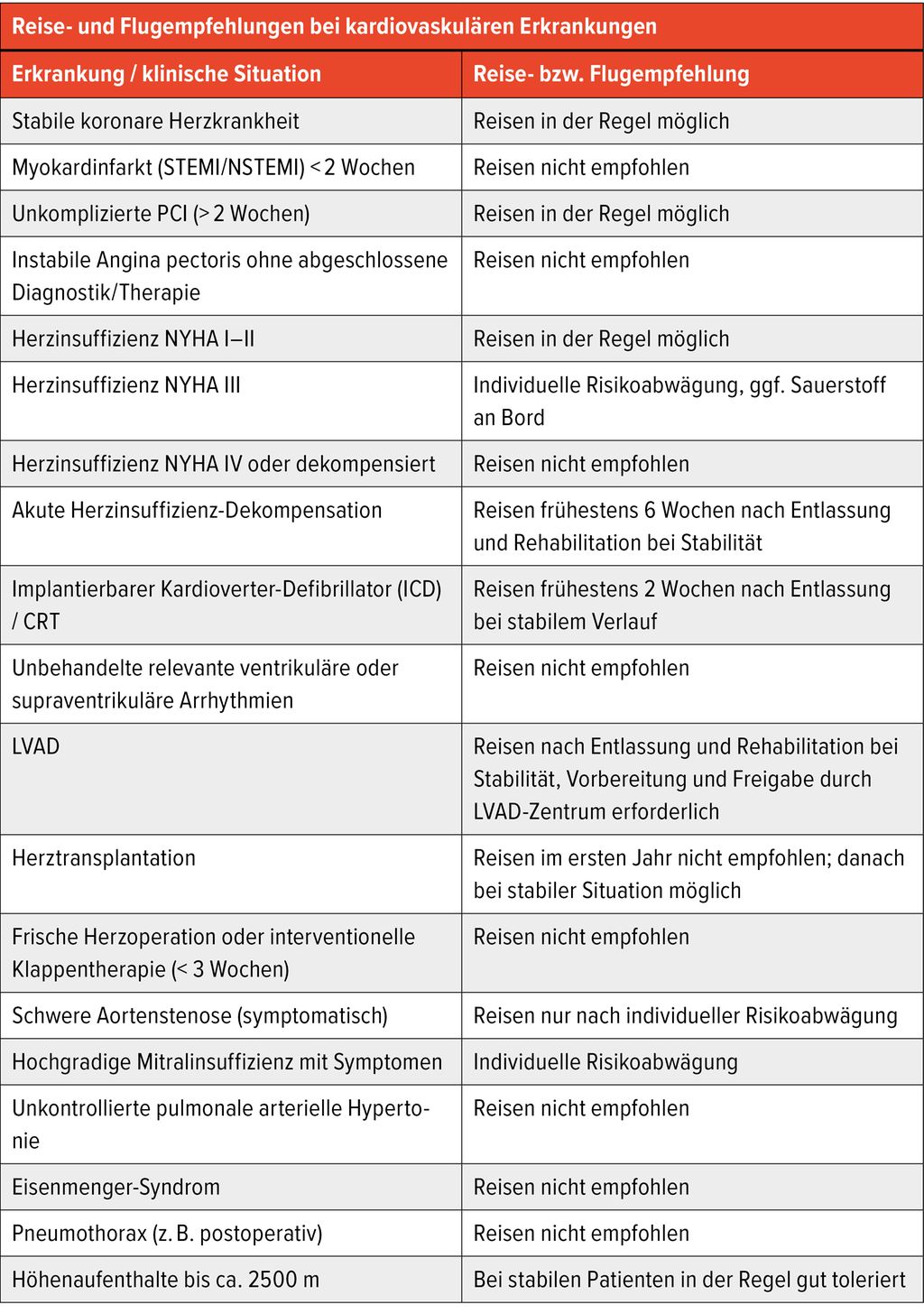 Tab. 1: Die Tabelle gibt eine Übersicht über Reise- und Flugempfehlungen bei häufigen kardiovaskulären Erkrankungen und klinischen Situationen. Für die meisten Empfehlungen existiert keine randomisierte Evidenz; sie beruhen auf pathophysiologischen Überlegungen, klinischer Erfahrung und Expertenkonsens. Die individuelle Beurteilung des klinischen Stabilitätsgrades bleibt entscheidend