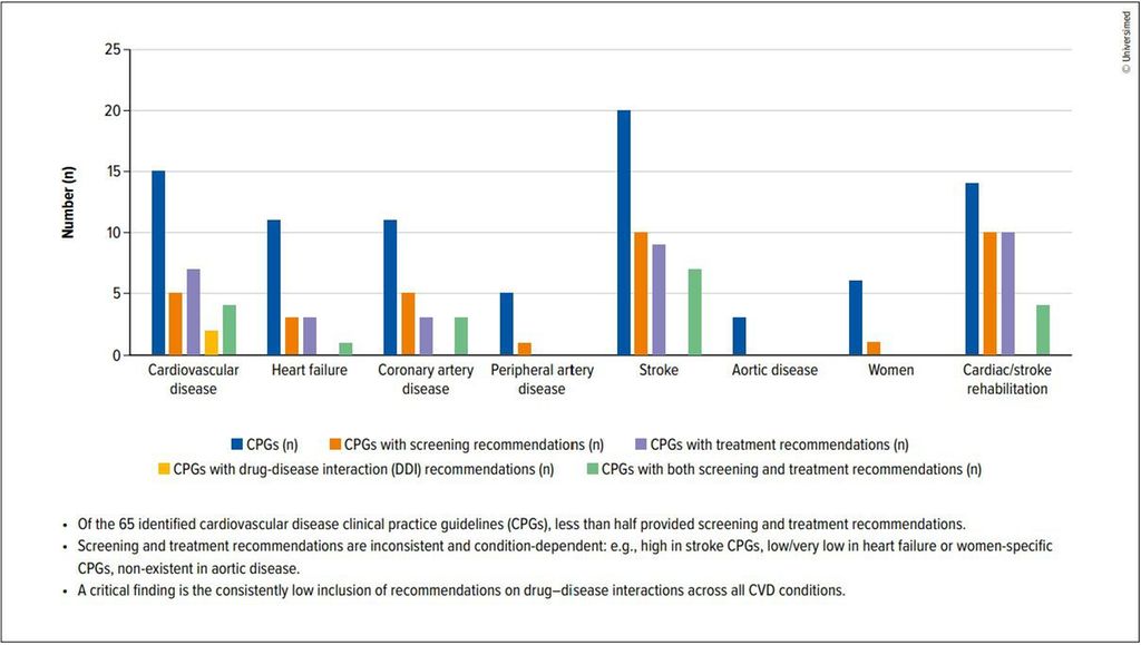 Clinical practice guidelines are designed to translate evidence into standardized, actionable recommendations. In areas such as diabetes, hypertension, and dyslipidaemia, guideline-directed care has transformed outcomes. Yet, the picture is markedly different when it comes to depression in CVD (Fig.1).6 Our review of 65 CVD guidelines across five continents revealed a gap between recognition of depression as a risk factor (71%) and provision of guidance: Only 23% included both screening and treatment recommendations (37% screening; 34% treatment), fewer than 3% addressed drug–disease interactions, an important concern given the high prevalence of polypharmacy in this population. Notably, just 12% involved mental health specialists in their development.6 Entire CVD areas, such as peripheral artery disease (PAD) and aortic disease, were almost silent on the issue of depression (Fig.2).6 Where recommendations existed, they varied widely in scope, specificity, and evidentiary strength. Screening was often encouraged, typically using PHQ-2 or PHQ-9, but without practical advice on implementation.6 Treatment recommendations ranged from psychotherapy and physical activity to SSRI, yet supporting evidence was often graded as low to moderate.6 Few guidelines addressed drug–disease interactions, despite polypharmacy being common in this population.6 This lack of systematic, high-quality guidance perpetuates underdiagnosis and undertreatment, leaving clinicians uncertain and patients at risk (Fig.3).
