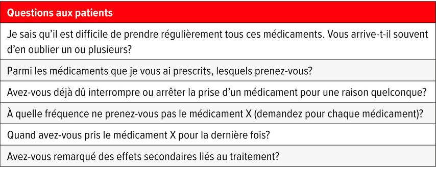 «On peut très clairement affirmer que l’approche ‹one-size-fits-all› ne fonctionne pas en ce qui concerne l’adhésion, mais que des solutions individuelles sont nécessaires. La première étape consiste à identifier le problème», a souligné A. Vischer. Dans ce cas, un questionnement ciblé, empathique et sans jugement peut souvent aider les patient·es à surmonter leur réticence à aborder le sujet de leur propre gré et à les sensibiliser à la prise correcte du médicament prescrit (Tab.1).15 «Cela prend certes du temps, mais cela en vaut la peine à long terme», a déclaré A. Vischer sur la base de son expérience.