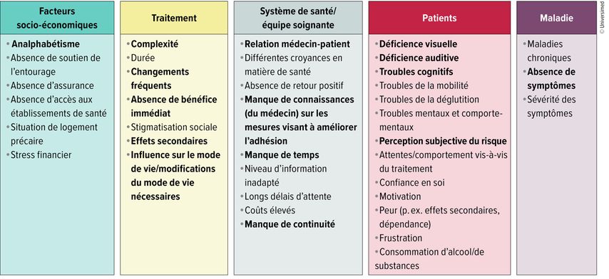 Les raisons de la non-adhésion sont multiples. Elle résulte des caractéristiques et des comportements propres aux patient·es, du type et de la sévérité de la maladie, de l’ampleur et des effets du traitement, des conditions du système de santé ainsi que des facteurs socio-économiques dans le cadre de vie des patient·es, comme le montre en détail la Figure 1.11