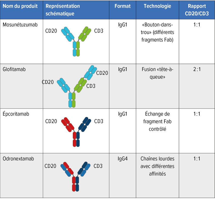 Dans les études de phaseII sur les lymphomes folliculaires récidivants, les données sur les anticorps bispécifiques mosunétuzumab,14 épcoritamab15 et odronextamab16 sont disponibles après plus de deux traitements préalables.