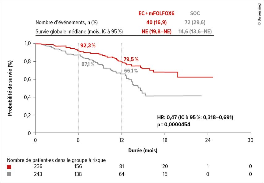 Dans cette étude à trois bras, les patient·es du bras de contrôle ont reçu un traitement de référence (SOC) par mFOLFOX6, FOLFOXIRI ou CAPOX avec ou sans bévacizumab. Les critères d’évaluation primaires étaient la survie sans progression (PFS) et le taux de réponse objective (ORR) selon une évaluation centrale indépendante. Des résultats primaires ont été présentés à l’ASCO GI pour comparer les bras de l’étude sous EC+mFOLFOX6 par rapport au SOC.1