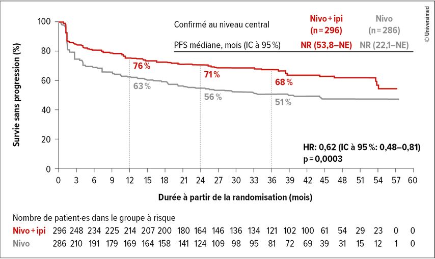 Fig. 2: Survie sans progression (PFS) sous nivolumab (nivo)+ipilimumab (ipi) par rapport à nivolumab en monothérapie (modifiée selon Andre T et al.)3