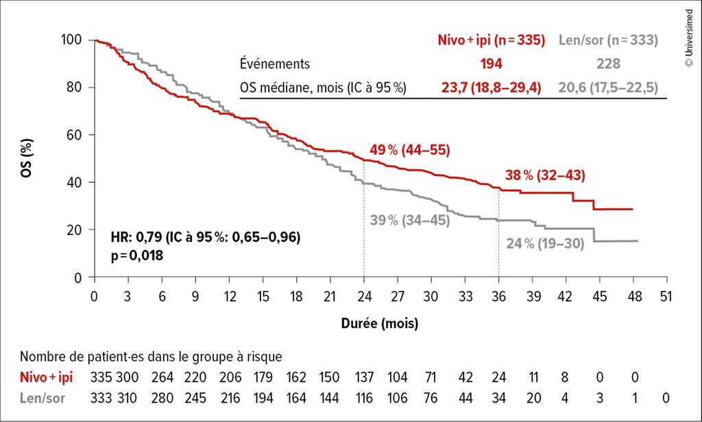 Au total, 668 patient·es naïf·ves de traitement ont été inclus·es et l’OS a été choisie comme critère d’évaluation primaire de l’étude. Après quatre cycles de traitement combiné, le nivolumab a été administré pendant deux ans maximum et l’inhibiteur de tyrosine kinase (ITK) jusqu’à la progression de la tumeur. Après une durée de suivi médiane de 35,2 mois, l’OS médiane était de 23,7 mois dans le bras sous immunothérapie par rapport à 20,6 mois dans le bras sous ITK.