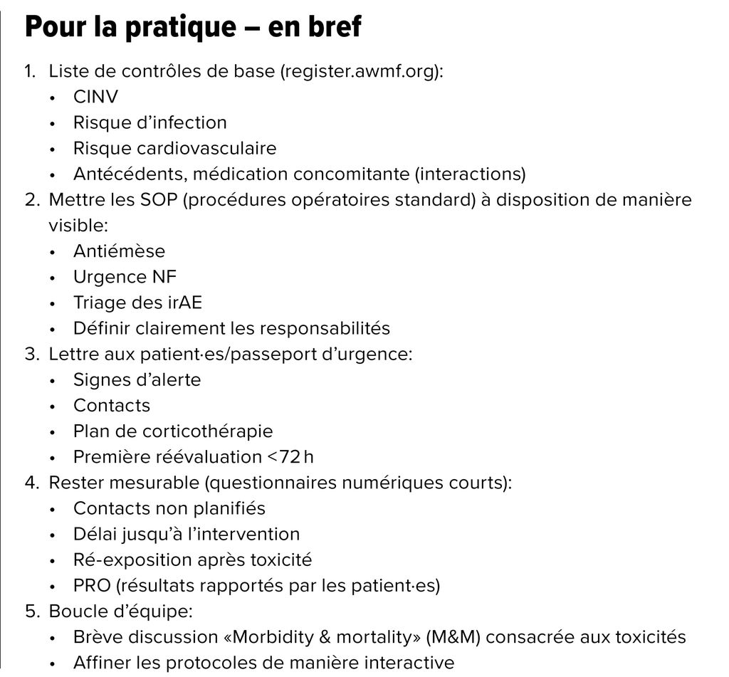 Gérer les toxicités liées à l’immunothérapie (irAE, «immune-related adverse events») selon l’organe concerné et le grade; définir des filières d’urgence claires.