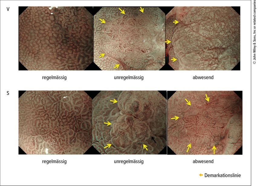 Bei der Erkennung früher Magenkarzinome kommt der makroskopischen Beurteilung nach der Paris-Klassifikation eine entscheidende Rolle zu. Flache (Typ 0–IIb) oder leicht eingesenkte (Typ 0–IIc) Läsionen, oft nur subtil von der umgebenden Schleimhaut abweichend, erfordern besondere Aufmerksamkeit. Unter NBI erlauben die MESDA(Magnifying Endoscopy Simple Diagnostic Algorithm)-Guidelines 21 sowie die Yao-Kriterien22 eine standardisierte Einschätzung suspekter Areale auf Basis mikrovaskulärer und mikroskopischer Muster. Ein irreguläres vaskuläres Netzwerk, Verlust der Oberflächenstruktur und Demarkationslinien (Abb.1) gelten als hochverdächtig für Neoplasien und sollten gezielt biopsiert oder reseziert werden. In der Praxis entscheidet die Qualität der Blickdiagnose damit zunehmend über die adäquate therapeutische Strategie.8,23