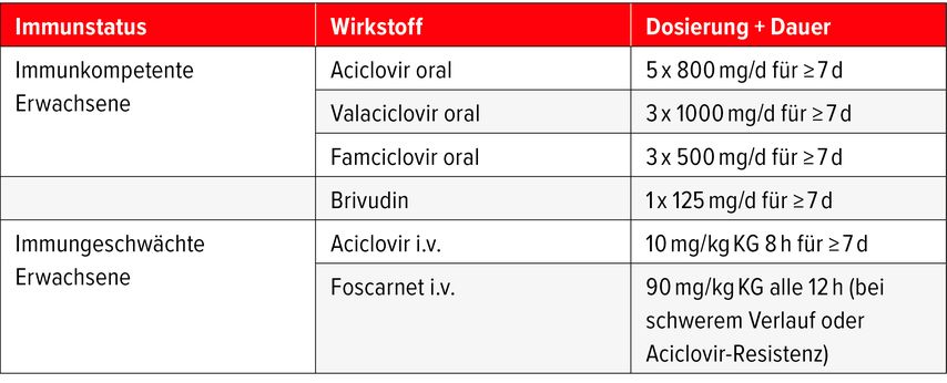Die Therapie besteht neben kalten Kompressen und Analgesie, gegebenenfalls topischen Antibiotika und topischen und/oder systemischen Kortikosteroiden, vor allem in der möglichst frühzeitigen (<72h) oralen oder systemischen antiviralen Behandlung (Tab.1).4